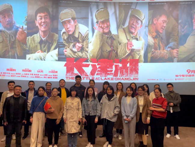习近平总书记《在党史学习教育动员大会上的讲话》强调,要注重方式方法的创新,推动党史学习教育深入群众、深入基层、深入人心,让红色基因、革命薪火代代相承。为了贯彻落实习近平总书记的重要讲话精神,创新形式做活基层党员党史学习教育。2021年10月24日,学院思政基础党支部与人文体育党支部共同开展了一场特别的主题党日活动,组织党员教师们观看红色电影《长津湖》。