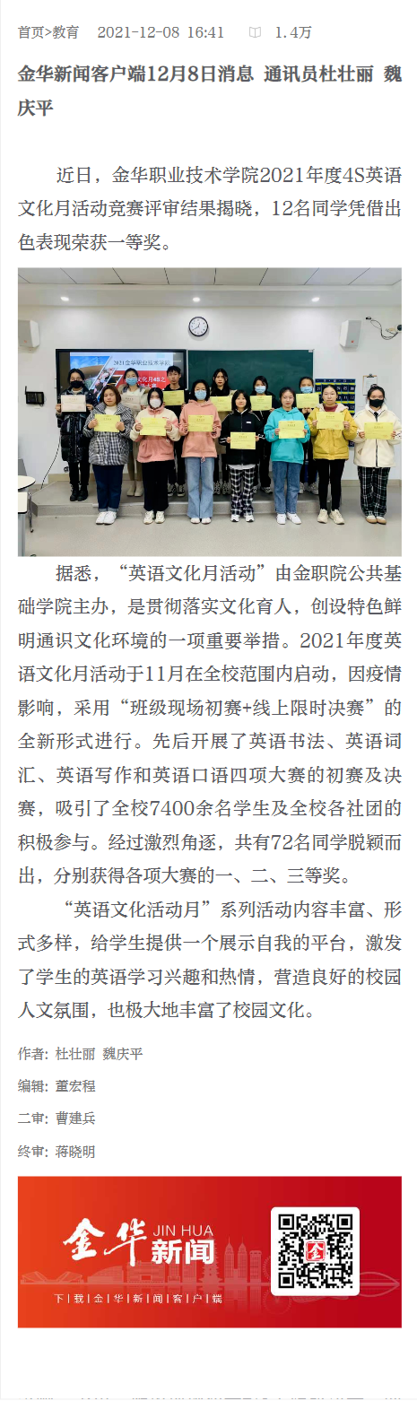 金华新闻客户端丨金华职业技术学院2021年度英语文化月活动圆满结束