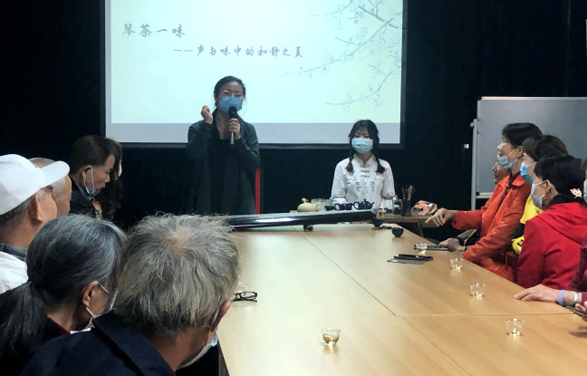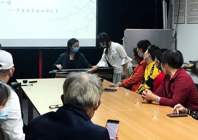 品茶间隙,汪珍调弦入弄,伴随琴声讲解传统乐器中著名乐器——古琴的前世今生,趣说传世唐琴“九霄环佩”与当代琴家李祥霆之间“高山流水遇知音”的故事。活动接近尾声,数位听众纷纷上来尝试弹奏,感受泠泠七弦之上的声音魅力。