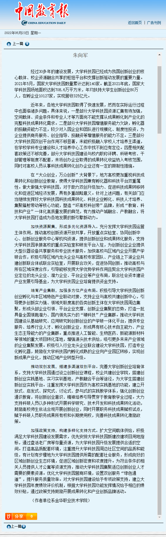 中国教育报丨朱向军:加速大学科技园建设 打造“环高校科创带”