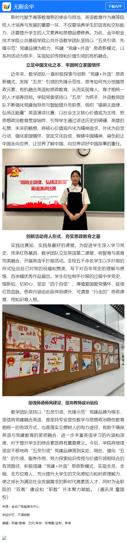 无限金华客户端丨五“员”引领构建“党建+外语”新平台,打造高校思政新模式