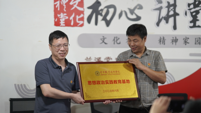 签约仪式上,上新屋村党支部书记童伟荣简要介绍了上新屋村的历史文化与发展历程。他表示,上新屋村有着深厚的红色历史文化底蕴与思政教育资源,在接下来的合作中,将会尽己所能提供支持与帮助。占建青对此表达了诚挚的感谢,并表示校地合作共建基地是一个开端,今后双方要保持密切联系,在课题研究、主题教育、实践教学等方面开展常态化合作,将合作走深、走实。接着,双方代表现场签署了校地合作协议,并共同为“金华职业技术学院思想政治实践教育基地”揭牌!
