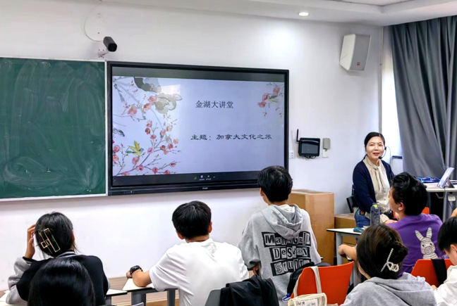 活动伊始,王艳华以“加拿大的基本概况”为切入点,从其国土面积、典型气候、语言特征和历史沿革四个方面让学生们对加拿大的国家发展和现状有了更深的了解:今年是建国156年,资源丰富,面积世界第二,人口少于中国贵州省;曾为英法殖民地,其语言文化和教育特点:英法两种官方语言,公共教育投入多、普及广。王艳华在讲述加拿大的语言和教育时,提到了中国语言文化和教育,让学生从对比中感受中华语言文明的悠久和中国公共教育的优越性,增强了学生的文化自信。