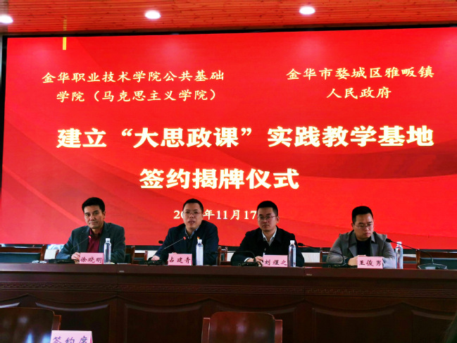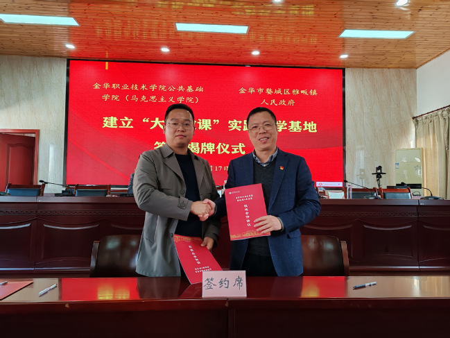 为深入贯彻落实习近平总书记关于“大思政课”的重要指示批示精神,充分运用地方资源优势构建具有地方特色的实践教学体系,11月17日,学院与金华市婺城区雅畈镇举行了“大思政课”实践教学基地签约揭牌仪式。学院院长占建青,雅畈镇党委书记刘煜之、党委副书记徐晓明、常务副镇长王俊男,及学院思政基础党支部全体党员参加了此次活动。