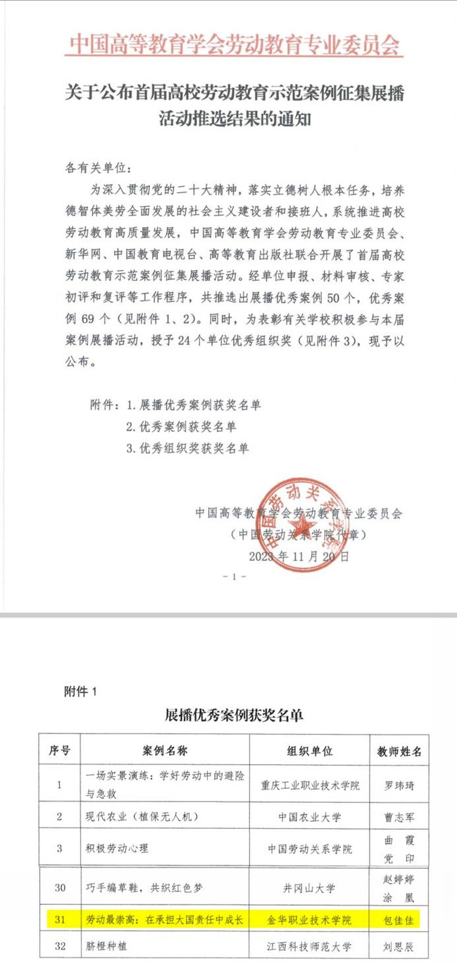 近日,由中国高等教育学会劳动教育专业委员会、新华网、中国教育电视台、高等教育出版社联合开展的“以劳树德 以劳启智”首届高校劳动教育示范案例征集展播活动推选结果公布。由我校教务处牵头,学院教师包佳佳申报的作品《劳动最崇高:在承担大国责任中成长》成功入选展播优秀案例,并荣登新华网展播,后续还将在中国教育电视台等高端平台展播,并由高等教育出版社集结出版。包佳佳还受邀参与12月8-9日在河北石家庄召开的案例展播活动总结交流会,并接受现场颁奖。