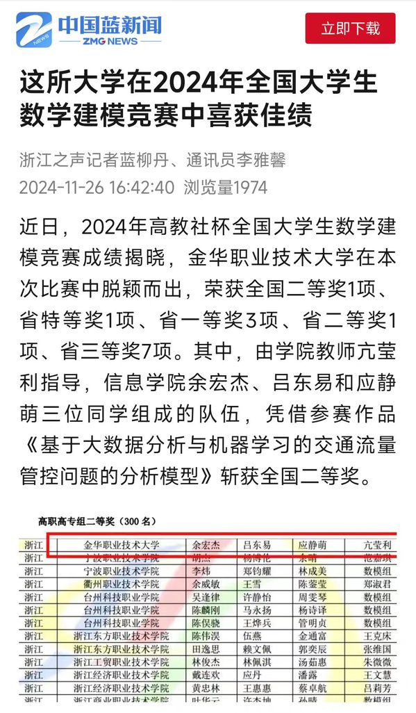 近日,2024年高教社杯全国大学生数学建模竞赛成绩揭晓,金华职业技术大学在本次比赛中脱颖而出,荣获全国二等奖1项、省特等奖1项、省一等奖3项、省二等奖1项、省三等奖7项。其中,由学院教师亢莹利指导,信息学院余宏杰、吕东易和应静萌三位同学组成的队伍,凭借参赛作品《基于大数据分析与机器学习的交通流量管控问题的分析模型》斩获全国二等奖。