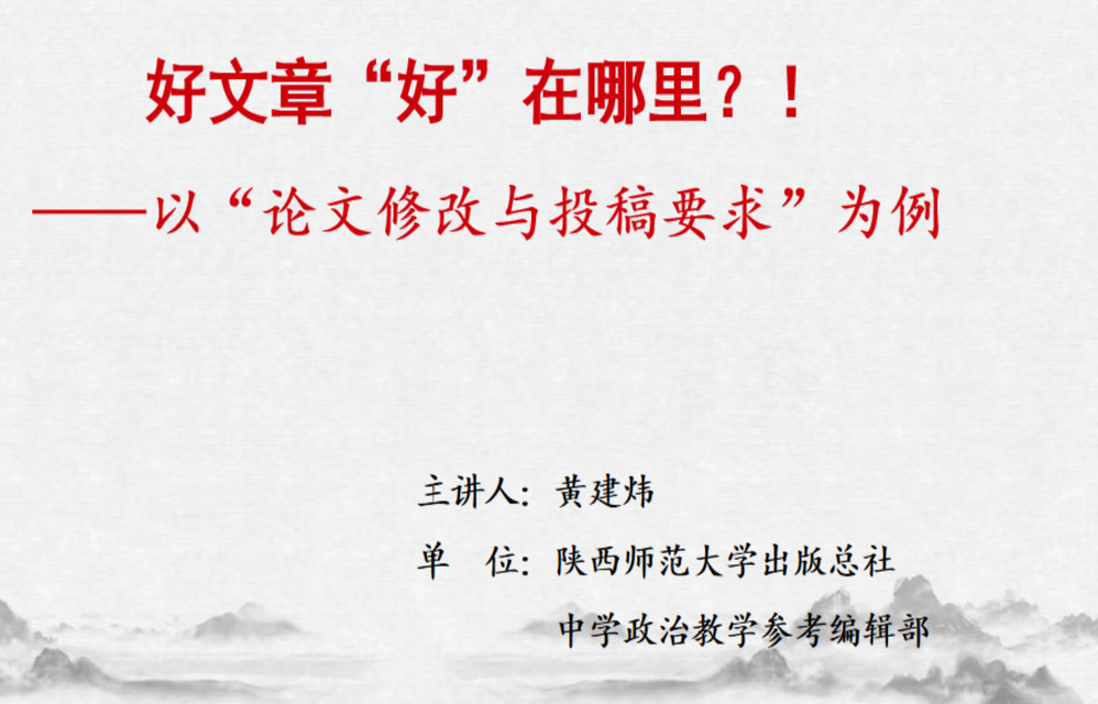 讲座中,黄老师围绕标题、摘要、关键词、正文等方面介绍了论文撰写、修改、投稿的技巧和规范,并结合《中学政治教学参考》近年来的优秀论文,从问题要聚焦、立意要高远、视角要新颖、切入要细小、热点要及时、素材要真实、思考要深刻、首尾要呼应、行文要流畅和文献要贴切等方面,详细讲解了好文章的“十个标准”。