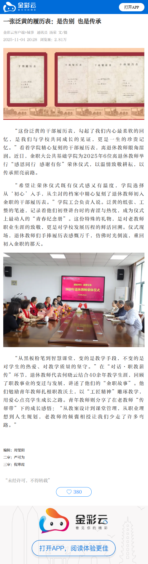 近日,金职大公共基础学院为6位离退休教师举办荣休仪式。学院复刻的初入职场干部履历表,唤醒了老教师们的青春记忆。仪式上,新老教师共话职教薪传,以温情致敬耕耘岁月,让坚守与热爱代代相传。