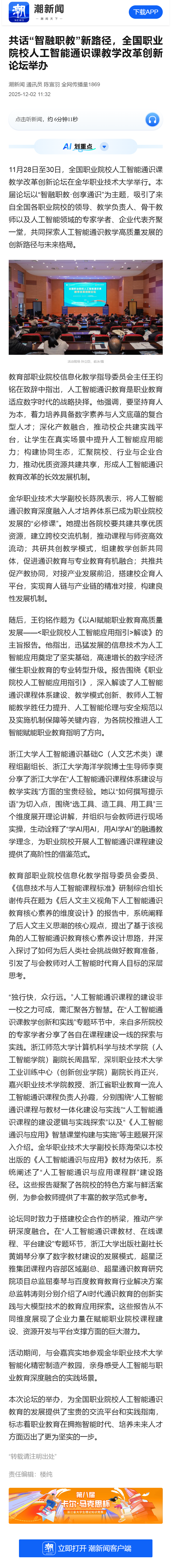 11月28日至30日,全国职业院校人工智能通识课教学改革创新论坛在金华职业技术大学举办。论坛以“智融职教·创享通识”为主题,来自全国各职业院校、科研机构、行业企业的专家学者、企业代表齐聚一堂,共同探索人工智能通识教学高质量发展的创新路径与未来格局。