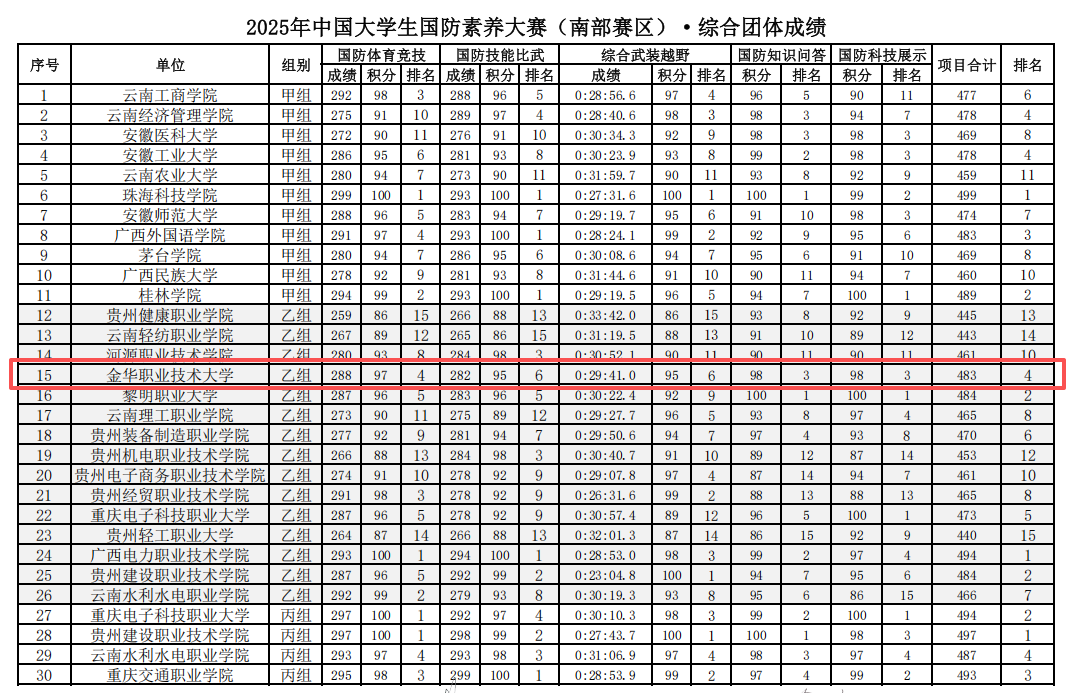 11月29日至12月3日,第三届中国大学生国防素养大赛(南部赛区)在贵州省贵阳市圆满落幕。我校公共基础学院军事与体育教学部李祖华、缪猛剑两位教师指导的校军事体育运动队,作为浙江省首支参与此项赛事的高校队伍,凭借出色发挥,从南部赛区27所高校的30支代表队中脱颖而出,荣获团体总分第四名,成功晋级全国总决赛,实现了浙江省高校在该项赛事中的历史性突破。