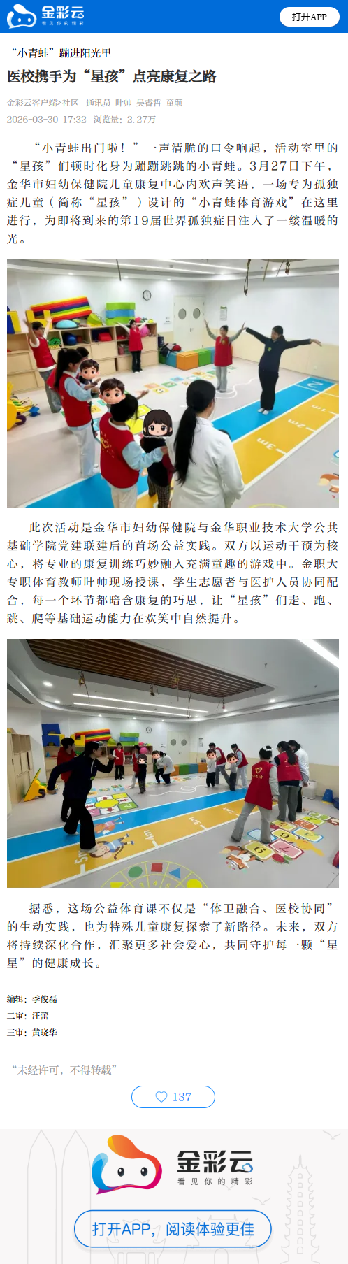 3 月 27 日下午,金华市妇幼保健院儿童康复中心开展 “小青蛙体育游戏” 公益活动,为孤独症儿童带来趣味康复体验。这是市妇幼保健院与金职院公共基础学院党建联建后的首场公益实践,以运动干预为核心,将康复训练融入童趣游戏,既提升孩子基础运动能力,也彰显体卫融合、医校协同特色,为守护 “星孩” 健康成长探索新路径。