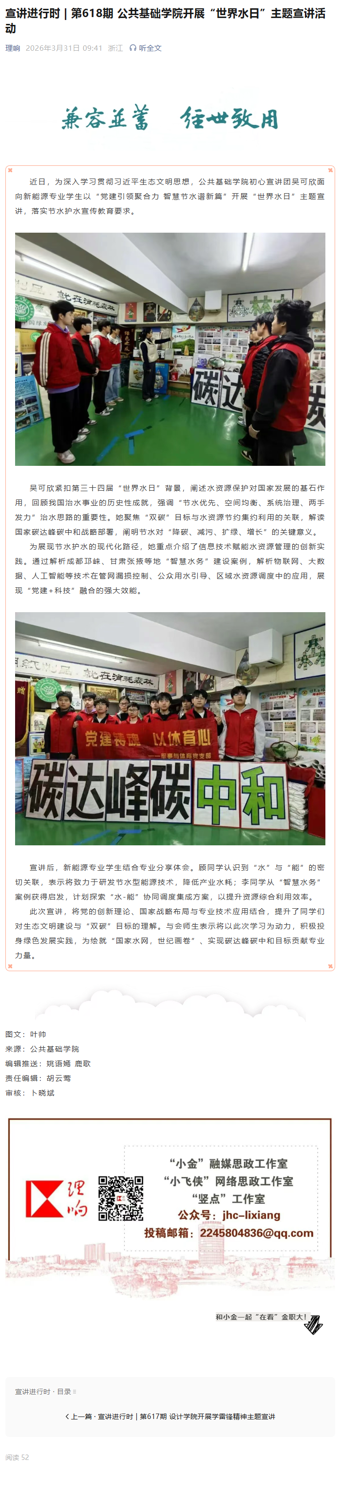 近日,公共基础学院初心宣讲团吴可欣面向新能源专业学生开展 “党建引领聚合力 智慧节水谱新篇” 世界水日主题宣讲。宣讲紧扣生态文明思想与 “双碳” 目标,解读治水思路与智慧水务实践,引导学生结合专业探索节水技术,助力绿色发展与国家水网建设。