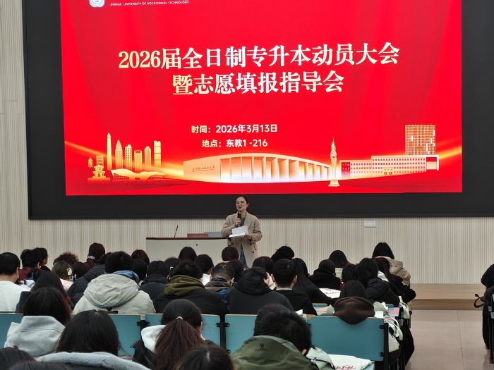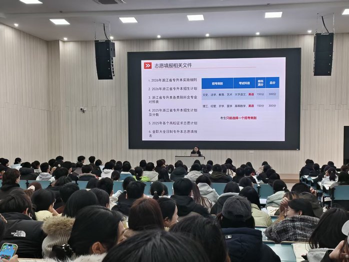顾敏艳副书记以去年87%的高上岸率激励大家,指出成功源于不服输的劲头和日复一日的坚持,并向同学们提出三点希望:一是要有破釜沉舟的决心,专注备考;二是要有滴水穿石的恒心,劳逸结合;三是要有从容淡定的静心,回归基础、稳住节奏。教师代表徐广美老师在表态中温情承诺:请同学们安心备考,老师们会全程陪伴、悉心指导。她叮嘱大家要好好学习、好好睡觉、好好休息,调整好状态,相信老师、相信自己。随后,专升本指导老师结合2026年招生政策变化,从填报时间节点、注意事项及志愿填报技巧等方面进行了详细指导,帮助学员科学规划志愿。