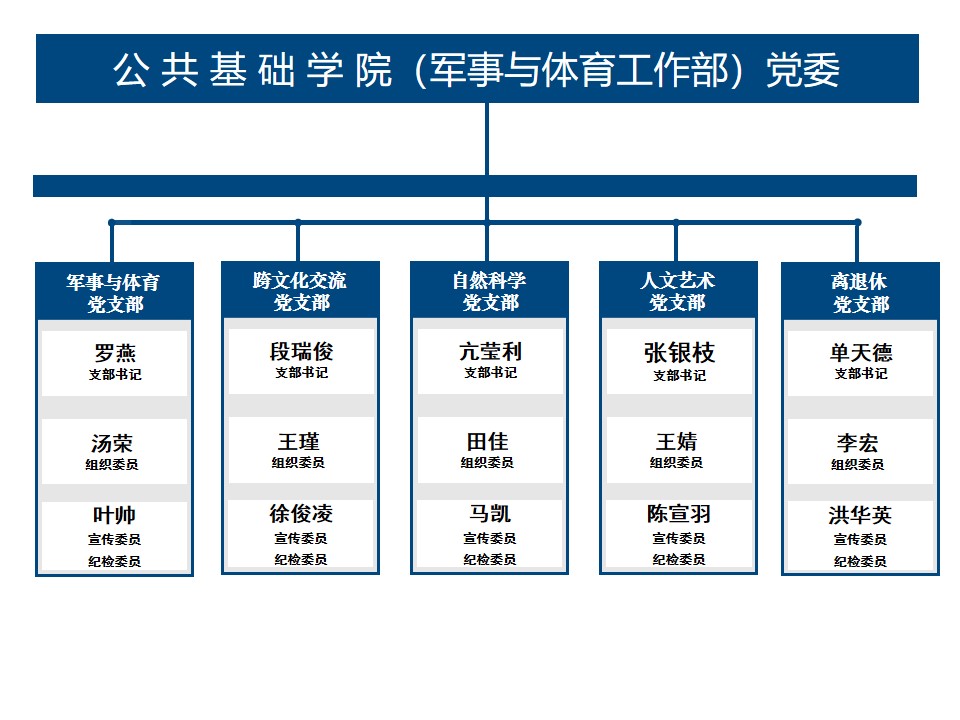 中共金华职业技术大学公共基础学院(军事与体育工作部)委员会下设5个党支部,即军事与体育党支部、跨文化交流党支部、自然科学党支部、人文艺术党支部、离退休党支部,共有党员70位。(更新至2025年9月)
